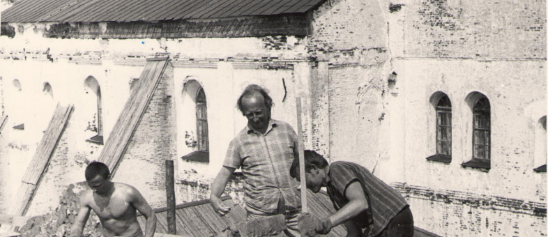 - В 1961 г., первый космонавт полетел в космос, и мы уже имели водородную бомбу, все МИФИшники прошли через Арзамас 16, и вдруг, здесь появляются студенты МИФИ, ребята, которые с 1 курса писали о неразглашении секретности, имели определенный доступ к засекреченной информации, стоит задуматься, какой путь им предначертан был в дальнейшем. Большинство посвятили всю жизнь строительной, реставрационной, архитектурной работе. Назову ребят из стройотряда: Владимир Паньков, Андрей Луженский, Маша Гурьева (еще и главным поваром была в стройотряде), Николай Брюханов, Борис Сизов (человек особой силы и энергетики, ушел в реставрационные мастерские, работал в должности заместителя генерального директора по науке в ЦНРП), Андрей Сартори, Владимир Морозов, Владимир Томилов, Валерий Страбыкин, Владимир Мирошниченко, Дмитрий Подъяпольский (сын Сергея Сергеевича Подъяпольского). Работали в больших больничных палатах, по крепостным стенам, в Ферапонтово строили гостиницу, в Горицах сень у скважины, в доме престарелых проводили противоаварийные работы, в Святых вратах. Решетка малого проема в Святых воротах была выполнена по моему заказу кузнецом Степановым. Грандиозные работы проводились в ц. Преображения. Часть отряда отправляли в г. Белозерск на строительство моста. Жаль имен, фамилий всех не назову, смотрим на фото, такие знакомые до боли лица – рассказывает Николай Владимирович Каменев, который перенял мастерство реставрации под руководством С.С. Подъяпольского, современную архитектуру изучал у одного из первых советских архитекторов-конструктивистов Б.Г. Бахрина.