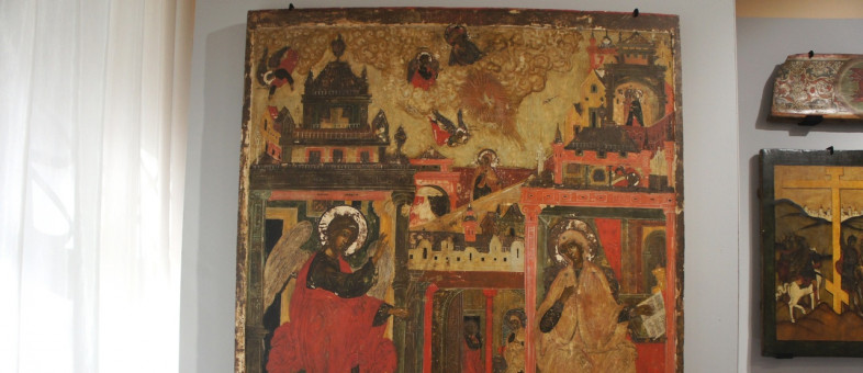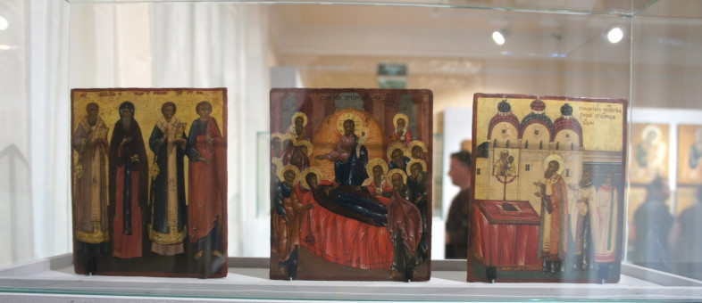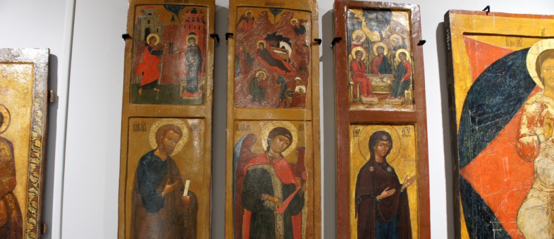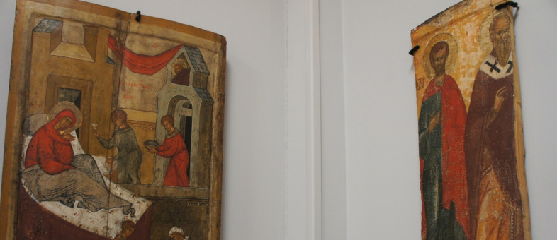 Крайний интерес представляет достаточно большая коллекция икон из Сольвычегодского музея и небольшие иконы, которые называются полотенца. Они написаны на холсте, загрунтованном с двух сторон. Такие двусторонние образы кладутся на амвон в храме во время праздников.