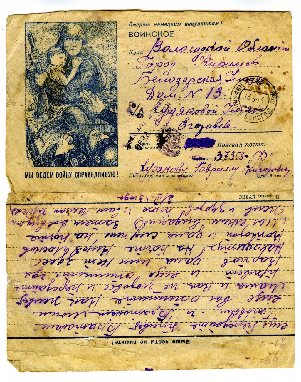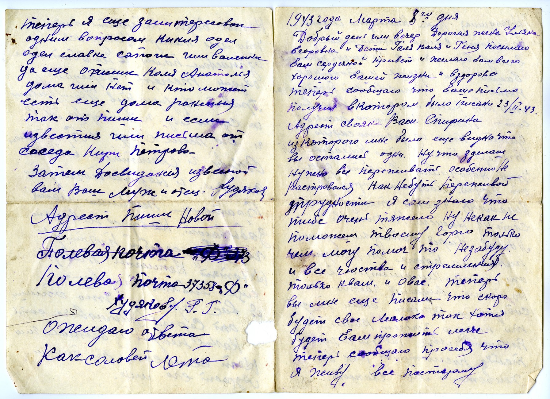 Письмо Г.Г. Худякова жене. 02.03.1943_лицо Письмо Г.Г. Худякова жене. 02.03.1943_оборот Письмо Г.Г. Худякова жене. 08.3.1943_лицо Письмо Г.Г. Худякова жене. 08.3.1943_оборот