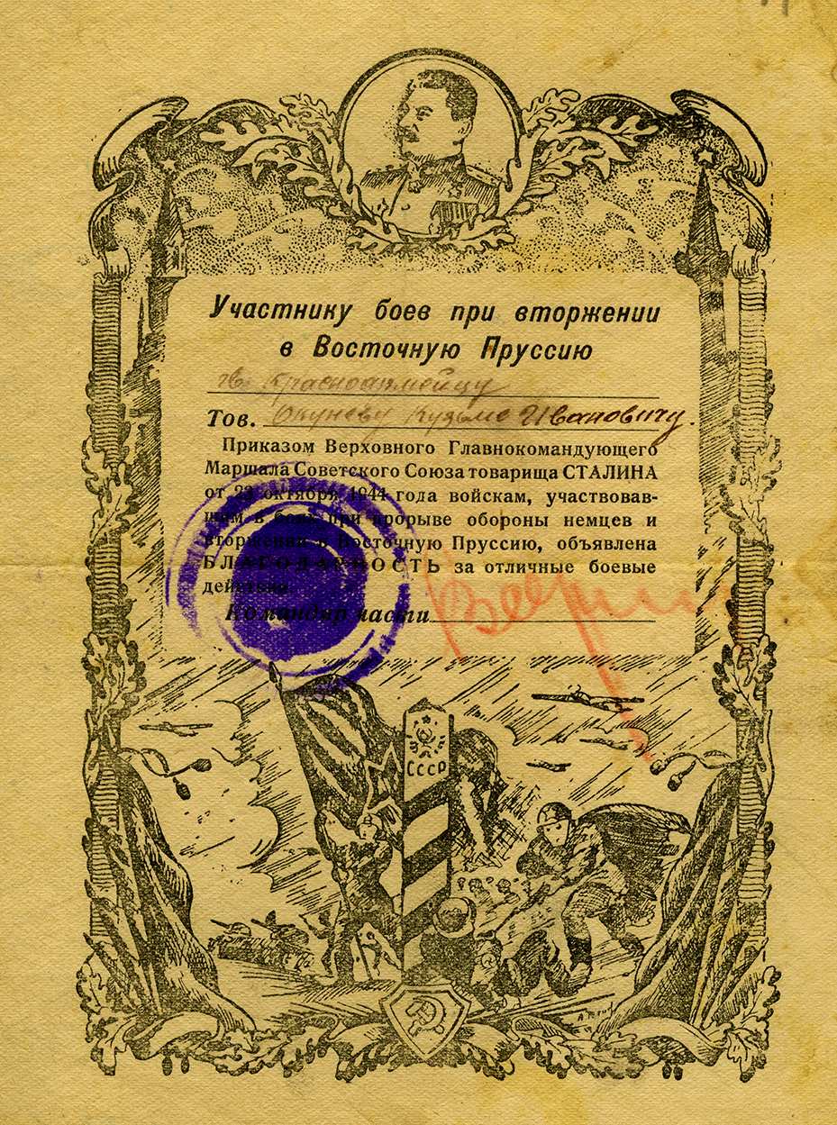 Благодарность К.И. Окуневу, 1944