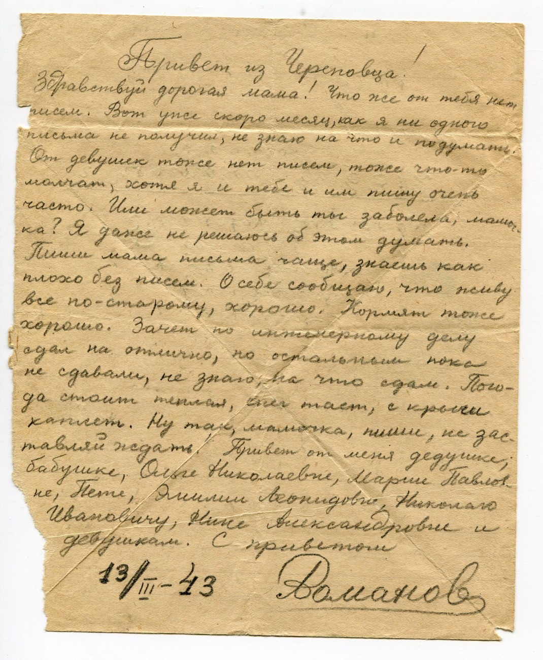 Письмо А.И. Романова матери. 13.03. 1943