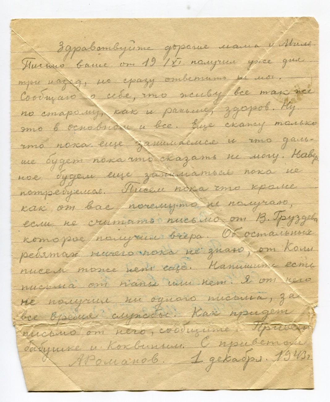 Письмо А.И. Романова родным. 01.12.1943