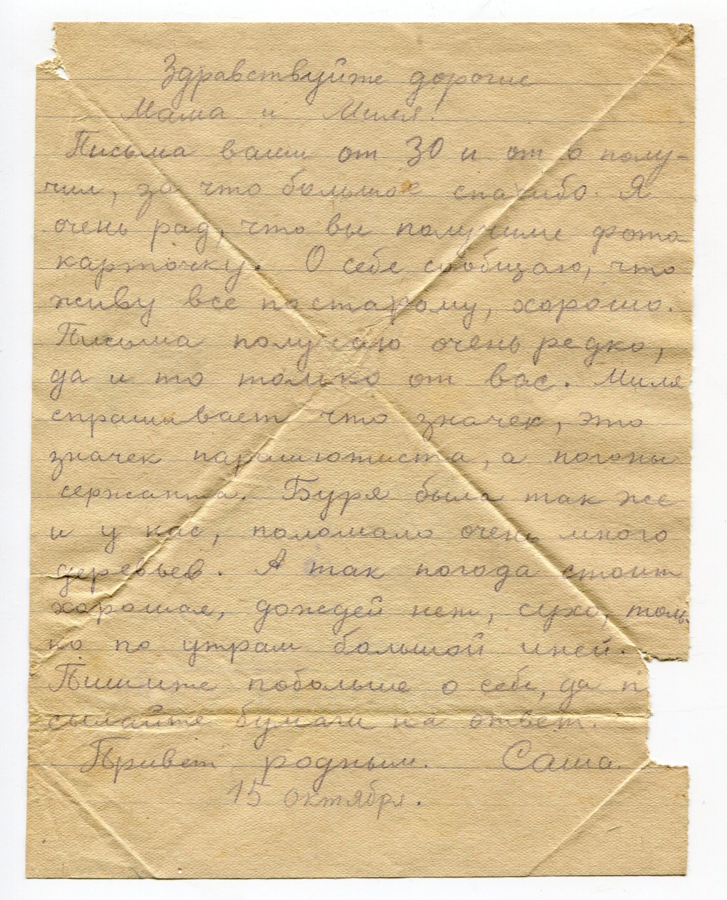 Письмо А.И. Романова родным. 15.10.1943