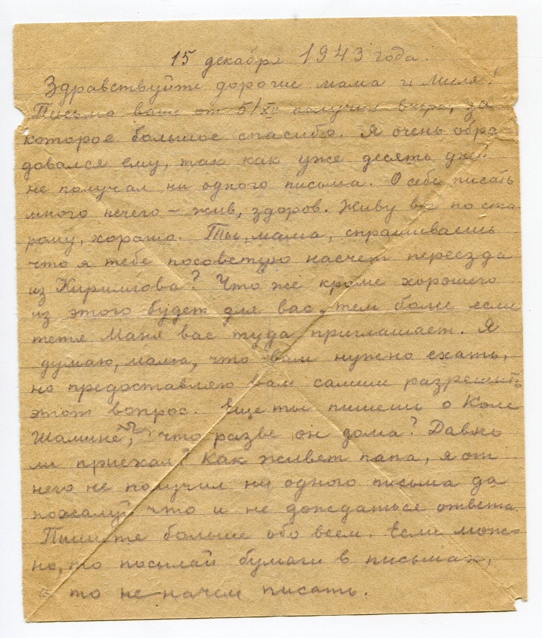 Письмо А.И. Романова родным. 15.12.1943