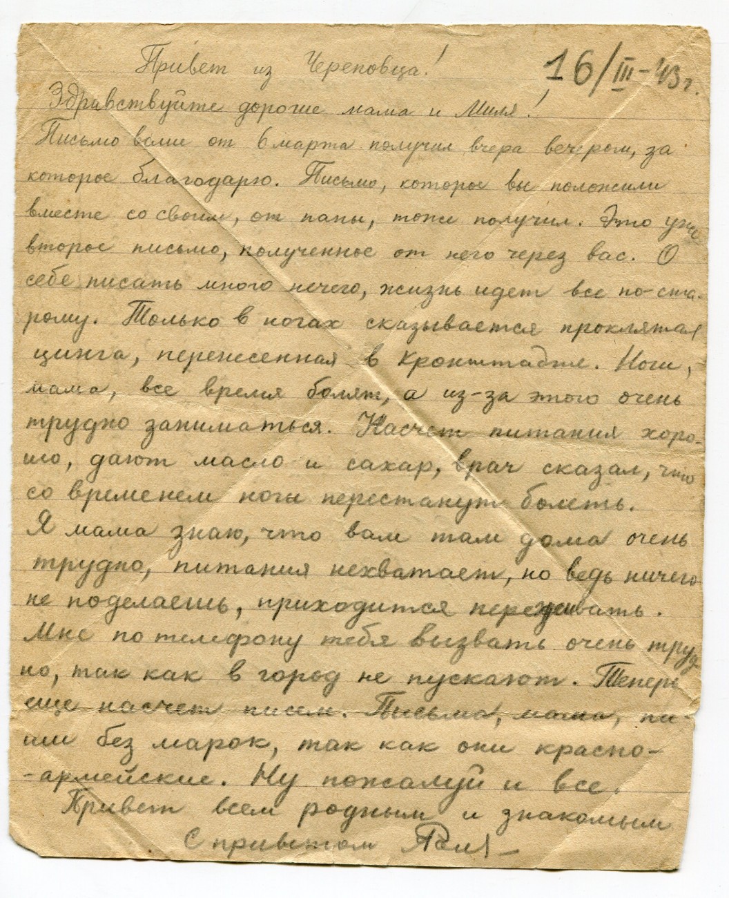 Письмо А.И. Романова родным. 16.03. 1943