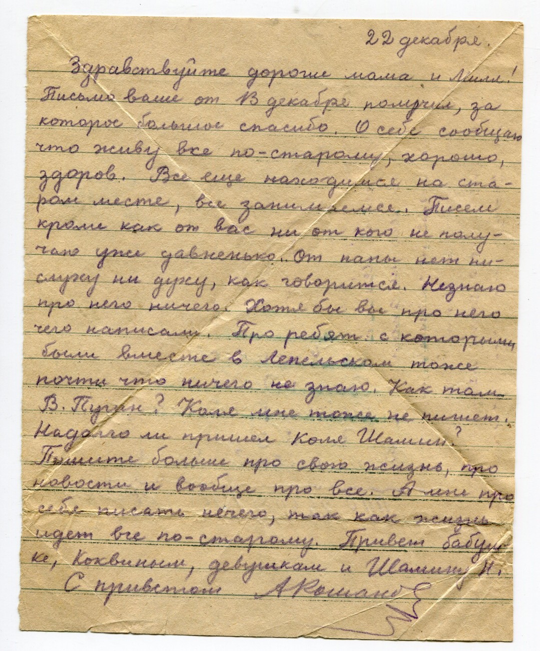 Письмо А.И. Романова родным. 22.12. 1943