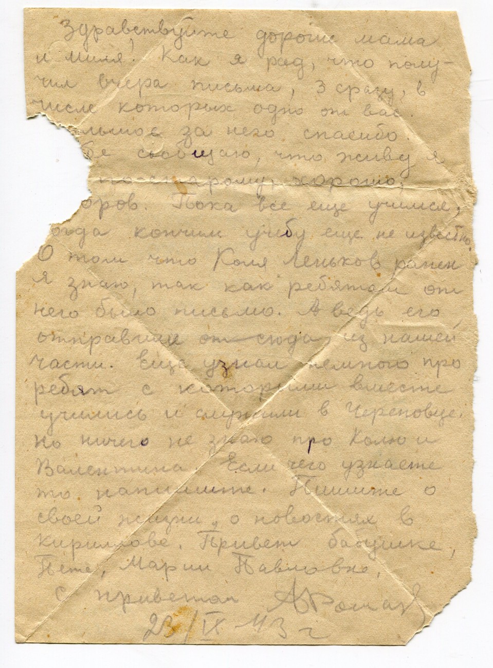 Письмо А.И. Романова родным. 23.09.1943