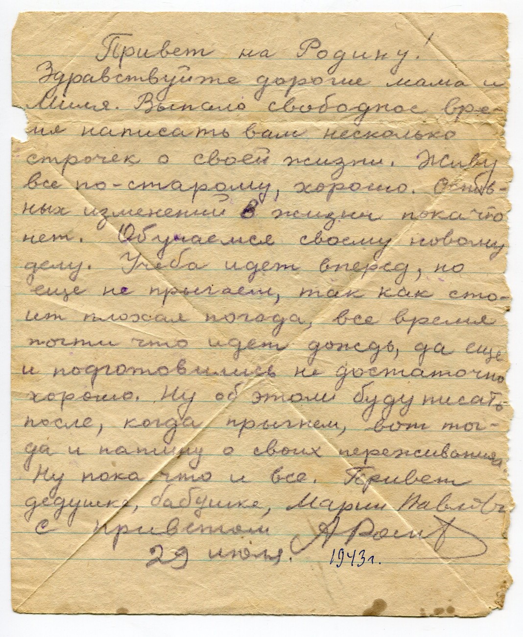 Письмо А.И. Романова родным. 29.07.1943