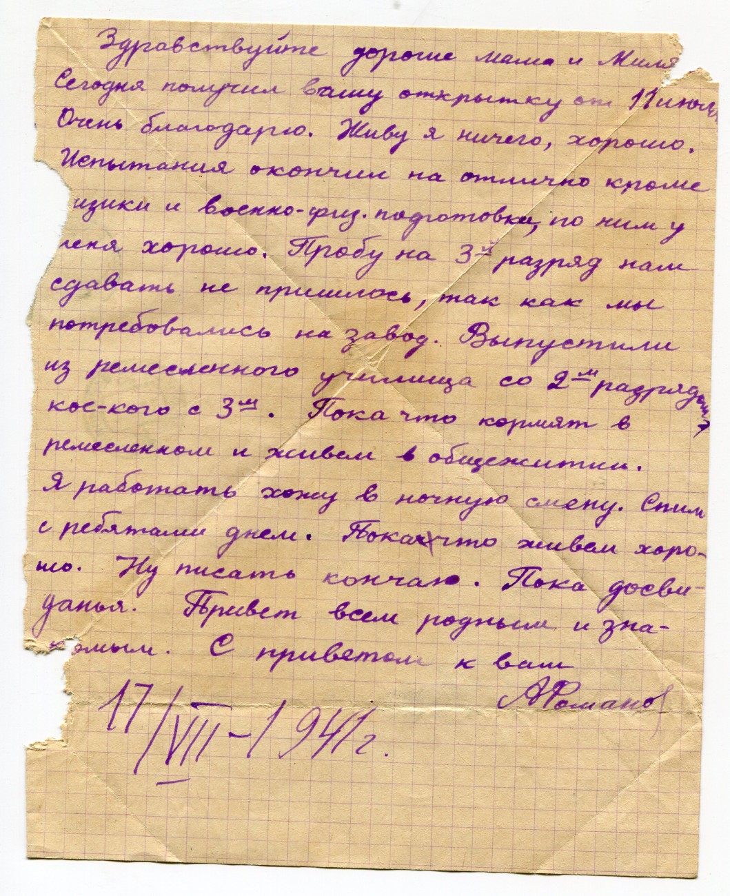Письмо А.И. Романова родным. 17.07.1941