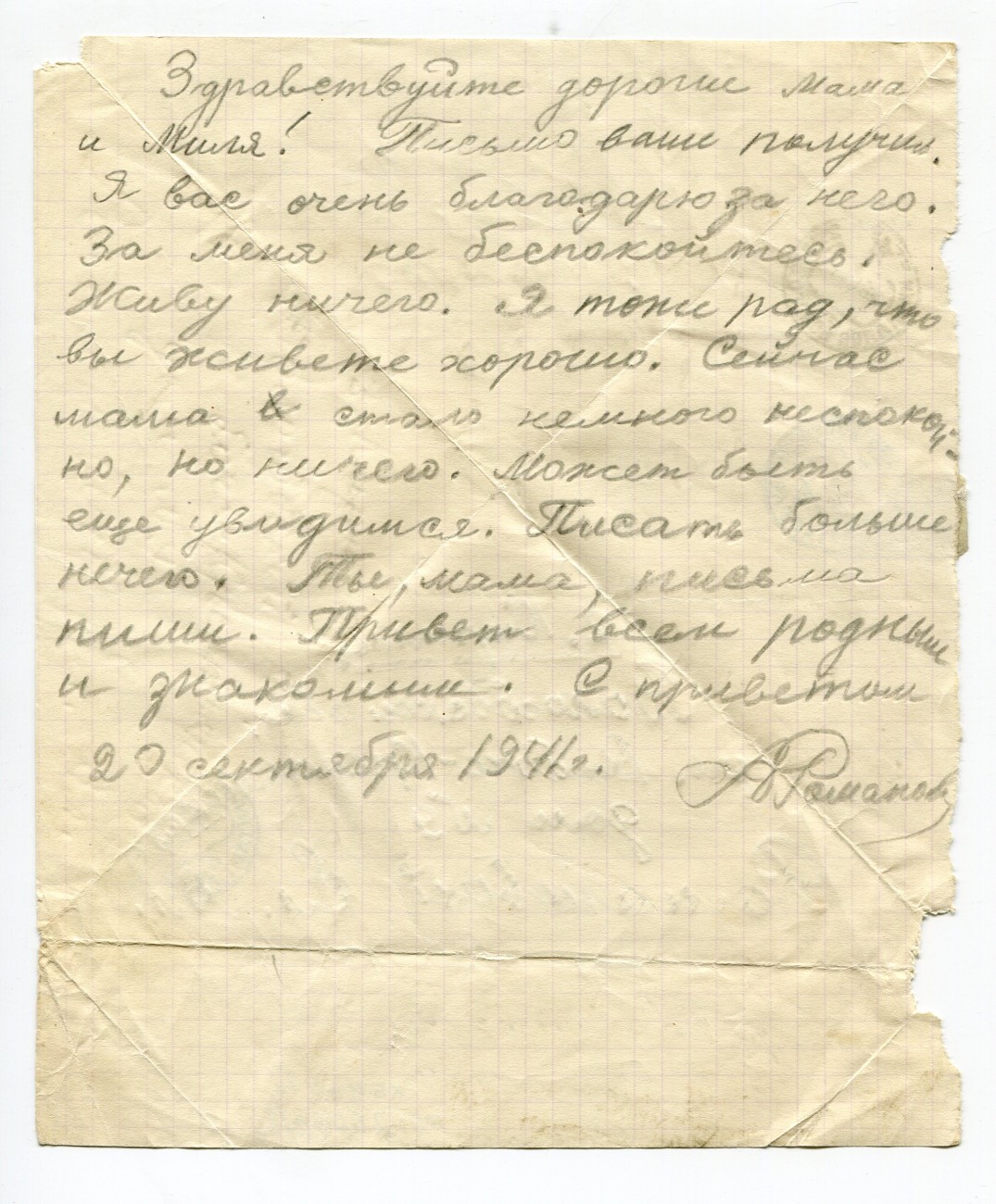 Письмо А.И. Романова родным. 20.09.1941