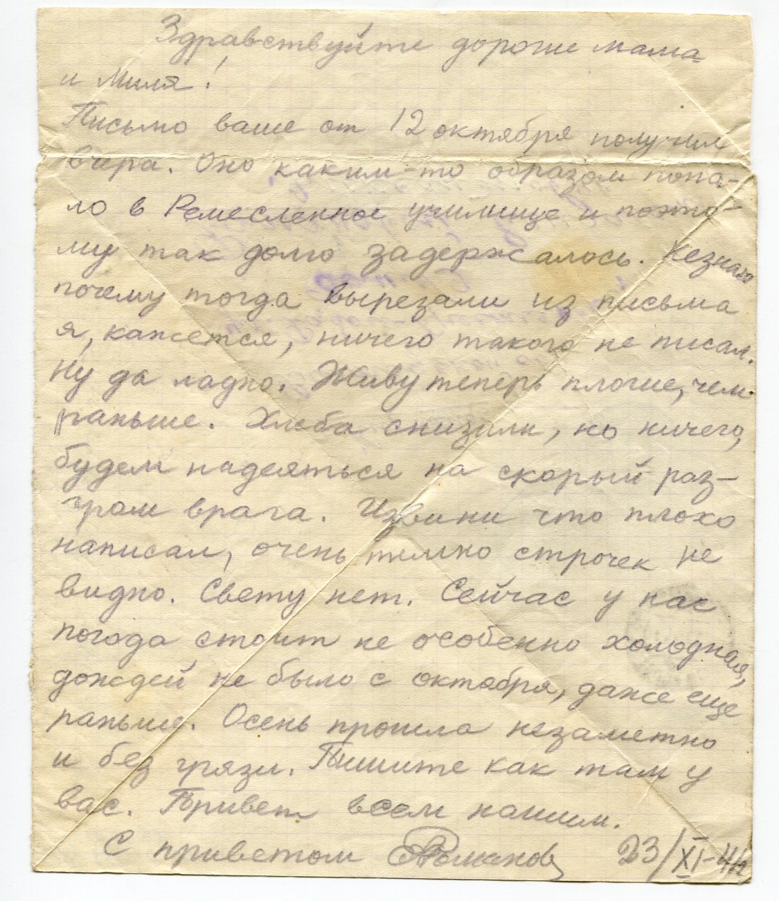 Письмо А.И. Романова родным. 23.11.1941