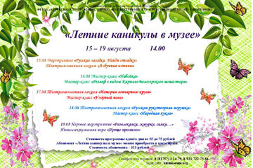 Интерактивные и тематические экскурсии Тематические и интерактивные экскурсии более углубленно раскрывают различные темы по истории и культуре Белозерья. Кирилло-Белозерский музей-заповедник предлагает ряд тем для занятий в музейных экспозициях.