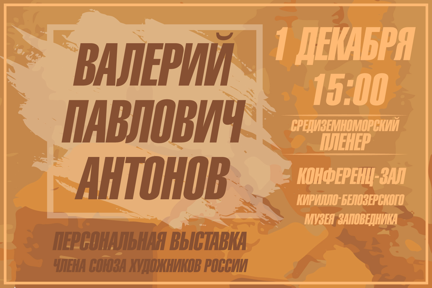 В конференц-зале Кирилло-Белозерского музея 1 декабря в 15:00 открылась персональная выставка Валерия Павловича Антонова, которая продлится до 21 января 2018 года. Художник родился в Омске, но с 29 лет его творческий путь оказался связан с Вологодской областью - он переезжает по работе сначала в Череповец, позже - Вологду. С 2004 года Валерий Антонович года живёт и работает в Греции вместе с супругой, являясь членом клуба ЮНЕСКО в Афинах. Художник прилетел из Греции со своими работами, что б представить их на своей персональной выставке в конференц-зале Кирилло-Белозерского музея-заповедника. Выставка также приурочена к юбилею художника - 6 декабря Валерию Павловичу Антонову исполняется 70 лет.