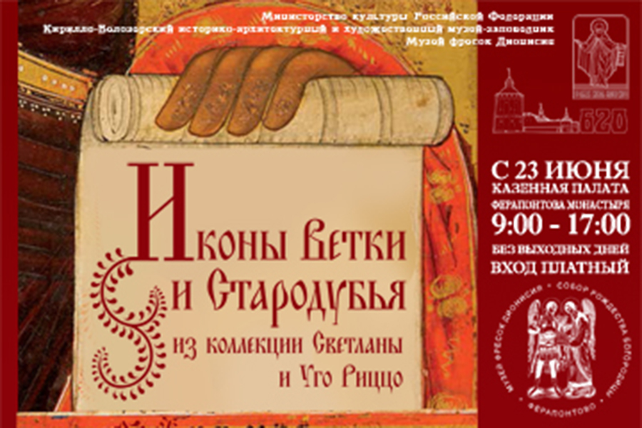 Ветка — город в Гомельской области Беларуси на реке Сож, лежащий на востоке Белорусского Полесья. Стародубье— лесистая местность на юго-западе России, современная территория Брянской области в России и Черниговской области в Украине. В конце XVII – начале XVIII оба центра активно заселялись староверами, впоследствии стали важных центрами старообрядчества. Эти два центра складывались практически одновременно, хотя первые последователи старой веры начали заселяться именно в Стародубье. Эти места, покрытые непроходимыми лесами и болотами, были надежным пристанищем для подвергавшихся жестоким преследованиям противников царской власти и нововведений патриарха Никона. На выставке "Иконы Ветки и Стародубья из коллекции Светланы и Уго Риццо" в Казенной палате Ферапонтова монастыря вы можете увидеть иконы, собранные из этих мест.